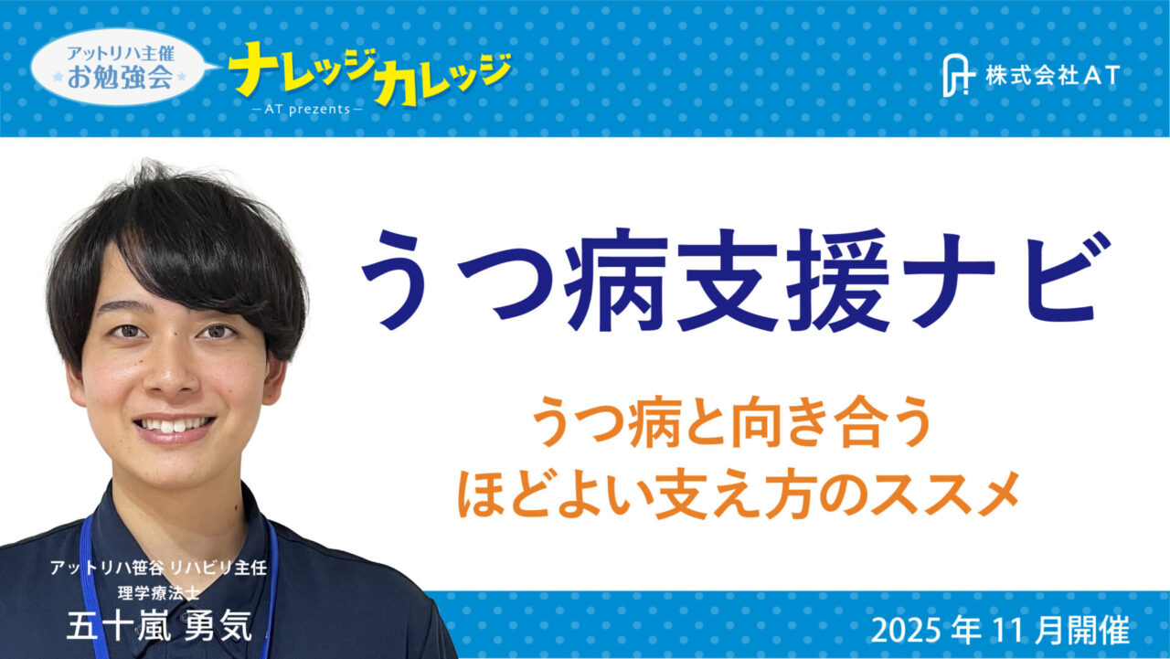 指定訪問看護アットリハが主催するオンラインセミナー \ナレッジカレッジ/今回のテーマはうつ病支援ナビ〜うつ病と向き合う ほどよい支え方のススメ〜 ぜひご覧ください! ※この動画は、2025年11月に行われたZoom勉強会のアーカイブです。 お知らせ